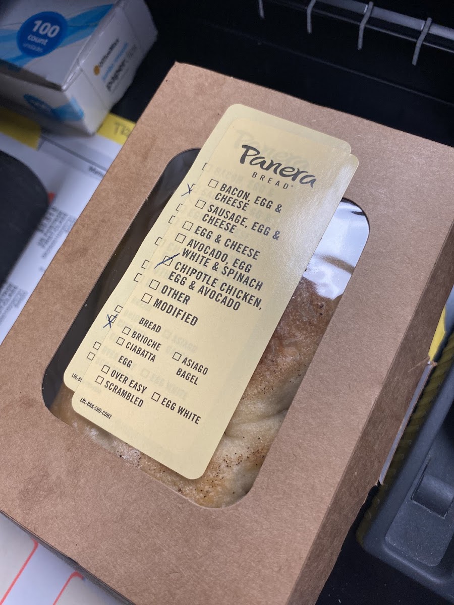 Sausage, scrambled egg, aged white cheddar, salt and pepper on Ciabatta.